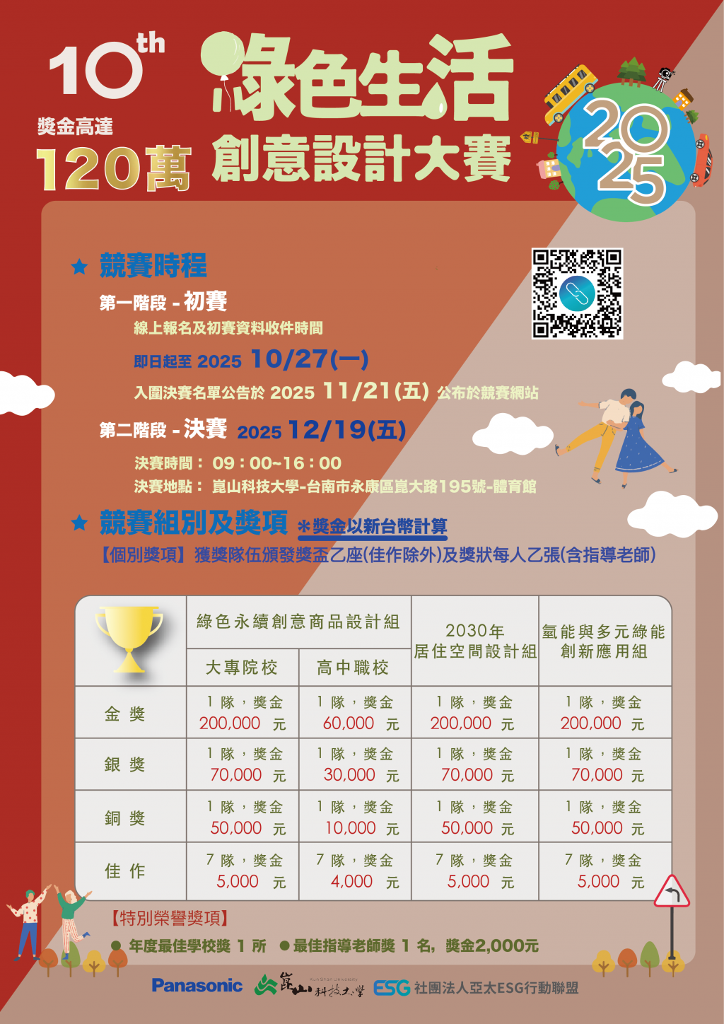 一、 | 台灣Panasonic集團自2015年每年定期舉辦「綠色生活創意設計大賽」,本校延續前九屆綠色生活創意設計大賽精神舉辦「第十屆2025 綠色生活創意設計大賽」,讓創造美好生活的核心精神從校園、城市開始深化,激發學子們對「淨零碳排與智慧低碳生活、永續能源」,共同建立永續的未來。 |