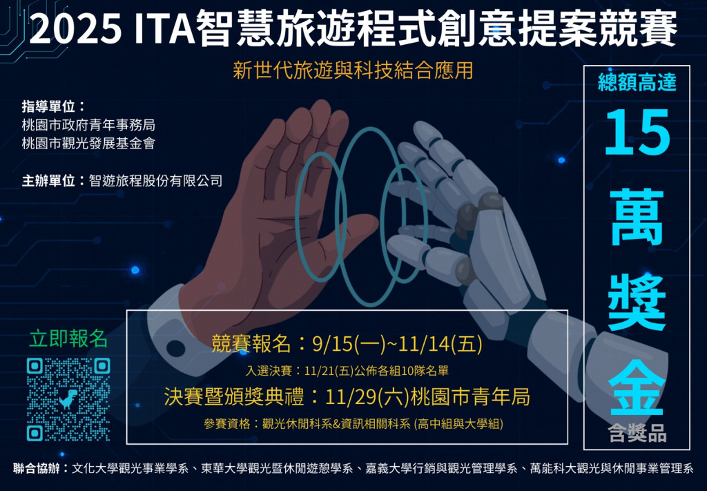 一、 | 智遊旅程股份有限公司係本局所輔導之青年創業團隊,致力於協助觀光旅遊產業完成數位化轉型;為發掘新世代旅遊與科技結合之可能性,智遊旅程股份有限公司辦理「2025 ITA智慧旅遊程式創意提案競賽」,鼓勵全國青年學子共同發想提案。 |