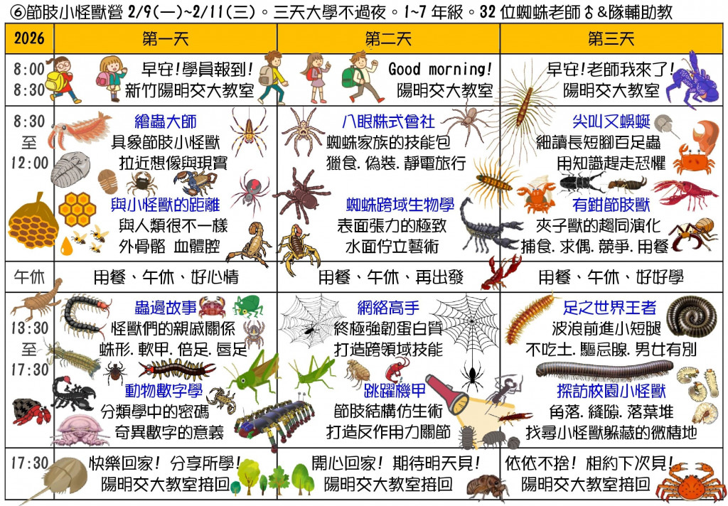 2026生態素養冬令營日期1/24~2/12,招生一-九年級學員,依不同課程分齡參加,詳細請見營隊課程網站 https://www.i3nature.com.tw/ 。 |