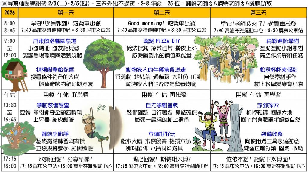 課程主題:①蘭陽山野求生營(5天4夜)、②小琉球海龜營(5天4夜)、③宜蘭生態農場營(3天2夜)、④TPE博物館生態營(3天外出不過夜)、⑤屏東柚園攀樹營(3天外出不過夜)、⑥節肢小怪獸營(3天大學不過夜)、⑦池上單車生態營(4天3夜)。 |
