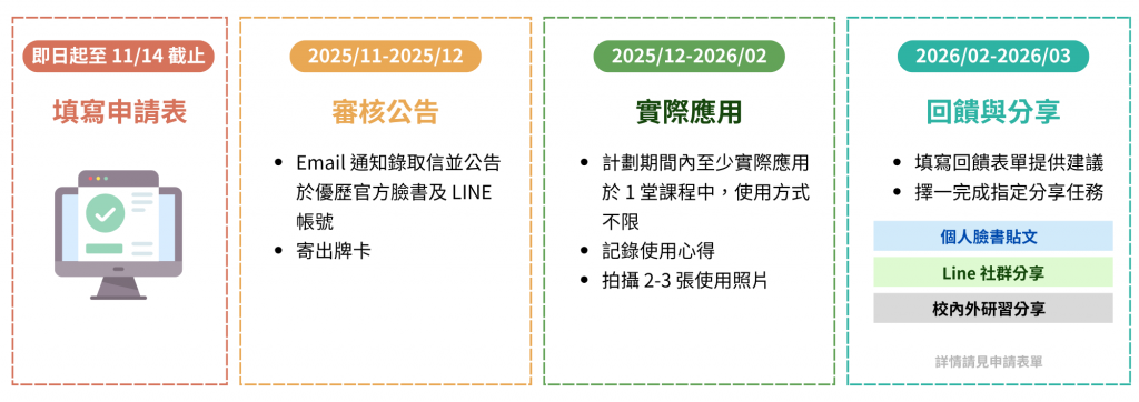 二、本牌卡提供全國高中職師長免費申請,申請者僅需提供使用回饋並完成指定任務(詳見「申請連結」所附任務與期程)。