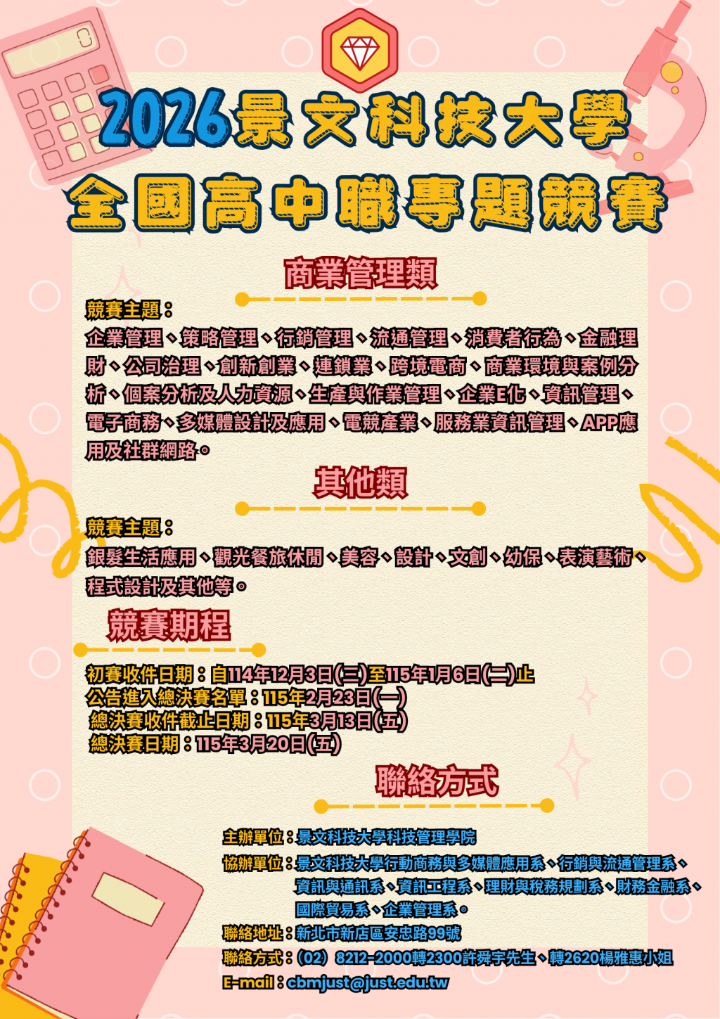 活動方式與報名方式、參賽相關資料詳如附件(景文科技大學2026全國高中職專題競賽活動計畫書)及報名網站(https://cbm.just.edu.tw/cbm2026/Menu/Poster.aspx)。