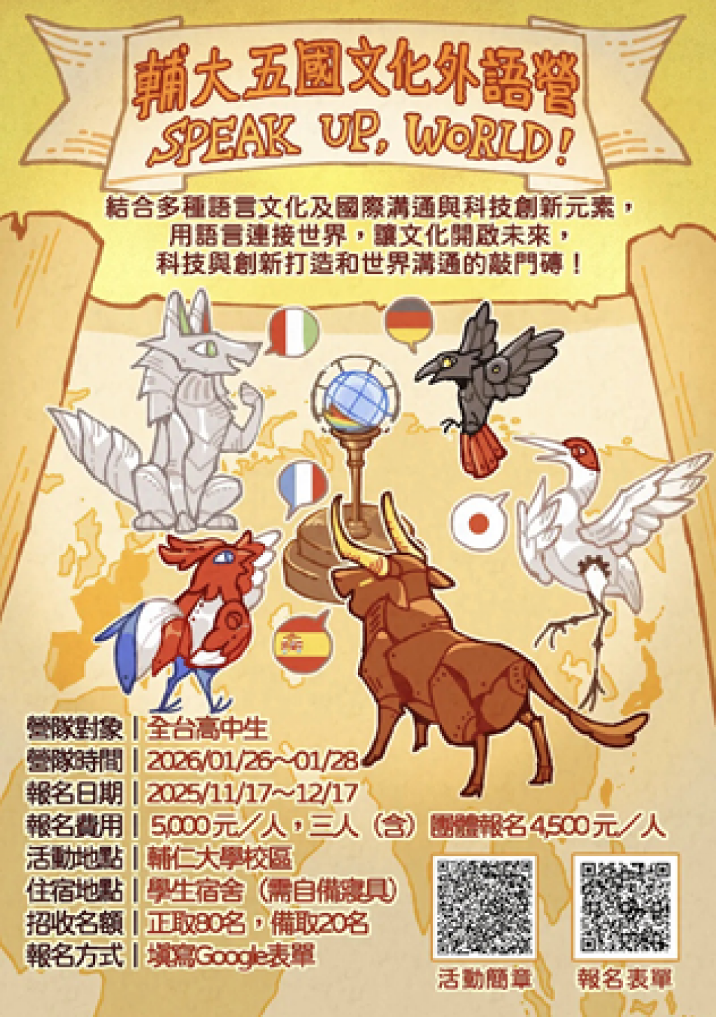 輔仁大學學校財團法人輔仁大學「2026 Speak Up, World! 五國文化外語營」招生資訊