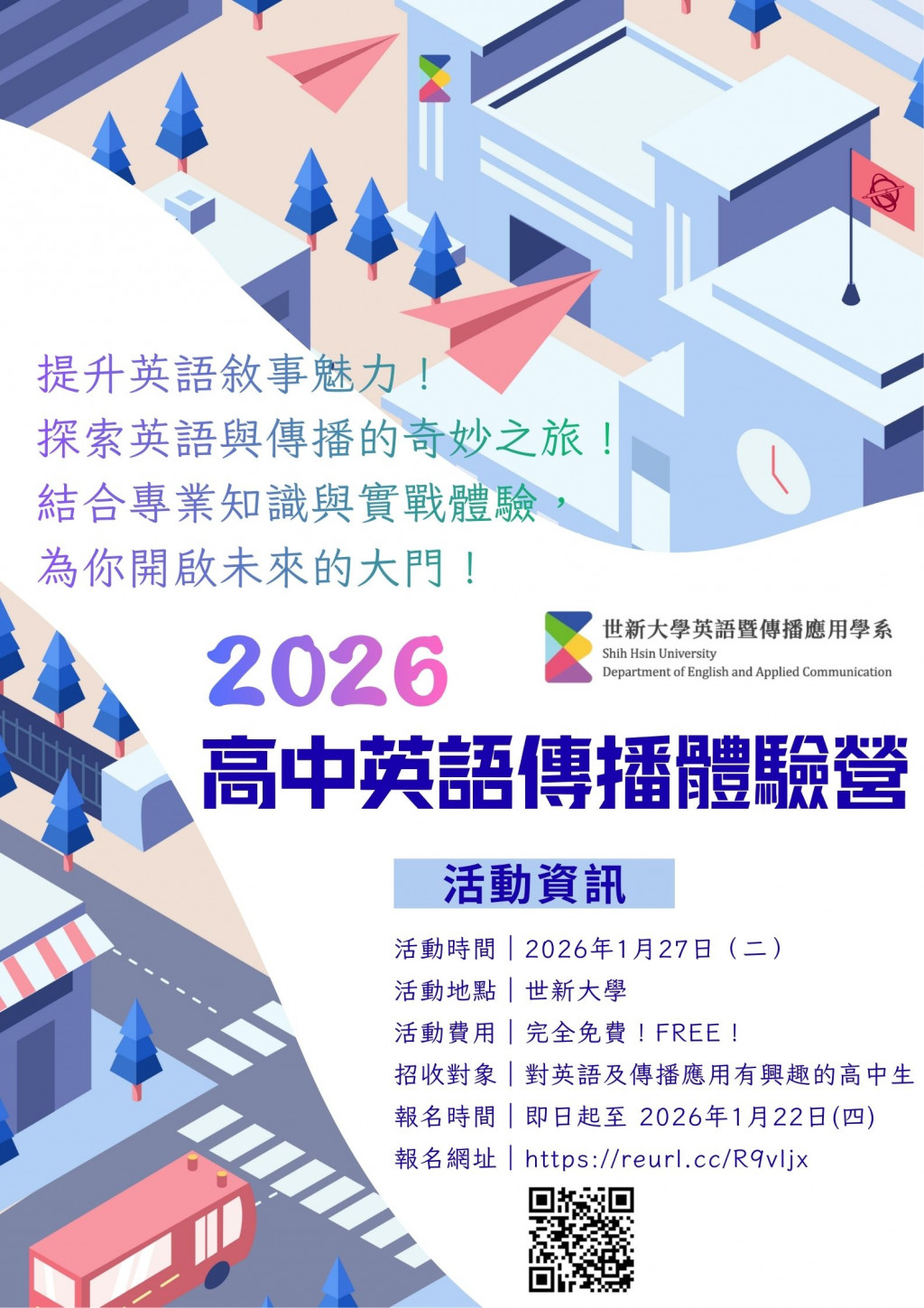 世新大學英語暨傳播應用學系辦理「2026高中英語傳播體驗營」簡章及活動海報