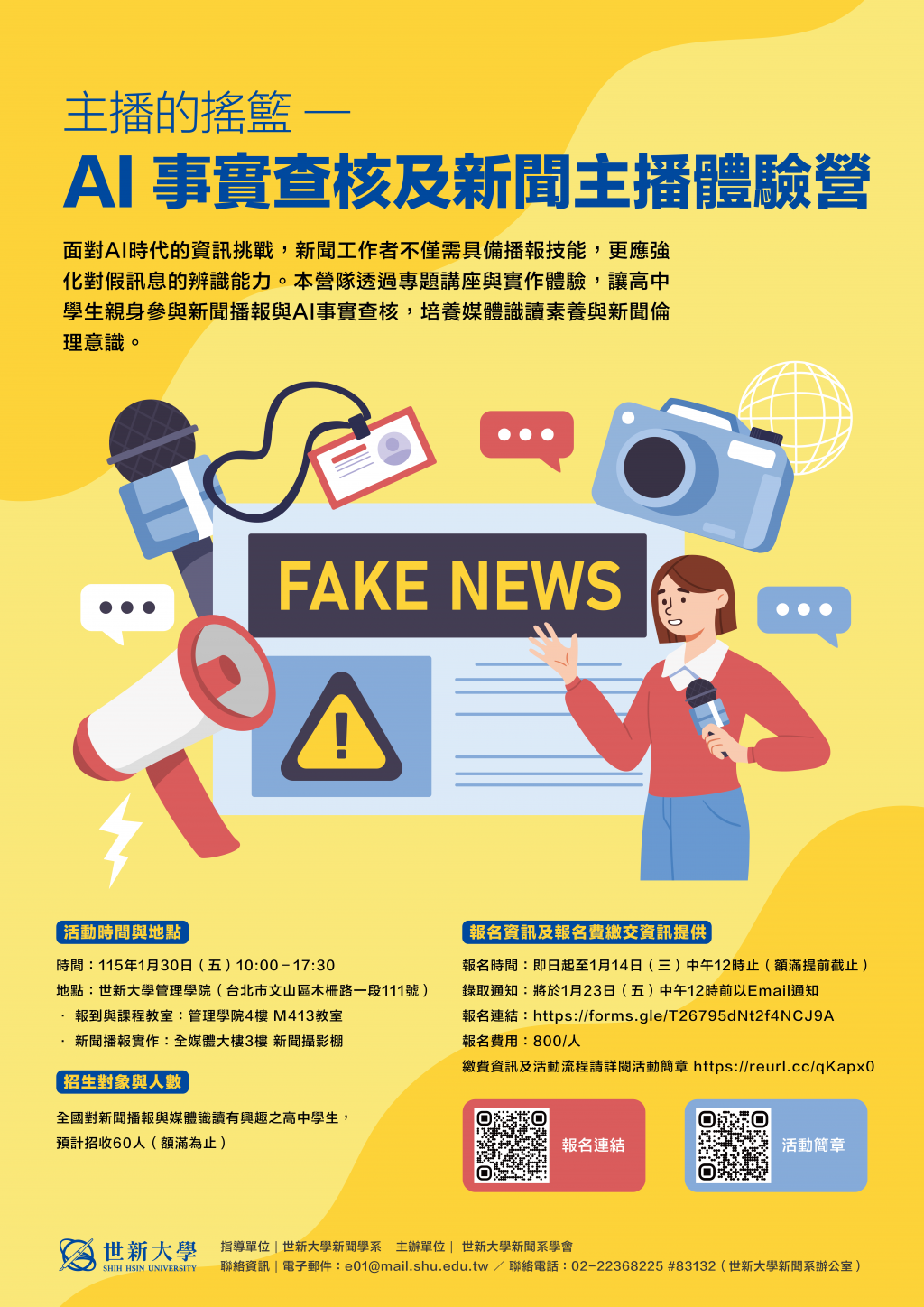 為提升高中學生對媒體識讀與假新聞辨識之能力,本系系學會特辦理「主播的搖籃—AI事實查核及新聞主播體驗營」,邀請對新聞傳播、媒體識讀或AI應用有興趣之學生參與。 |