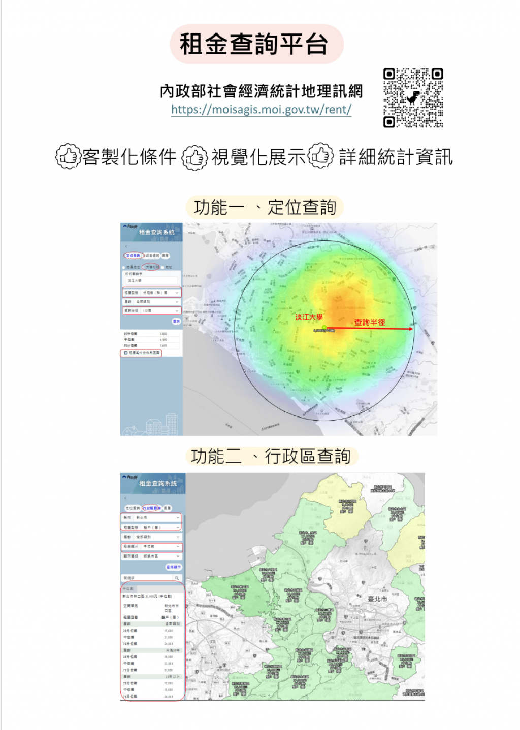 | 一、 | 內政部每年定期於1月及7月公布全國租金統計相關資訊,並同步推出視覺化「租金查詢平臺」(網址:https://moisagis.moi.gov.tw/rent/),定位查詢範圍內不同租屋型態或屋齡之最新租金總價四分位數,俾快速找尋合適租屋地點及評估租金合理性。 |