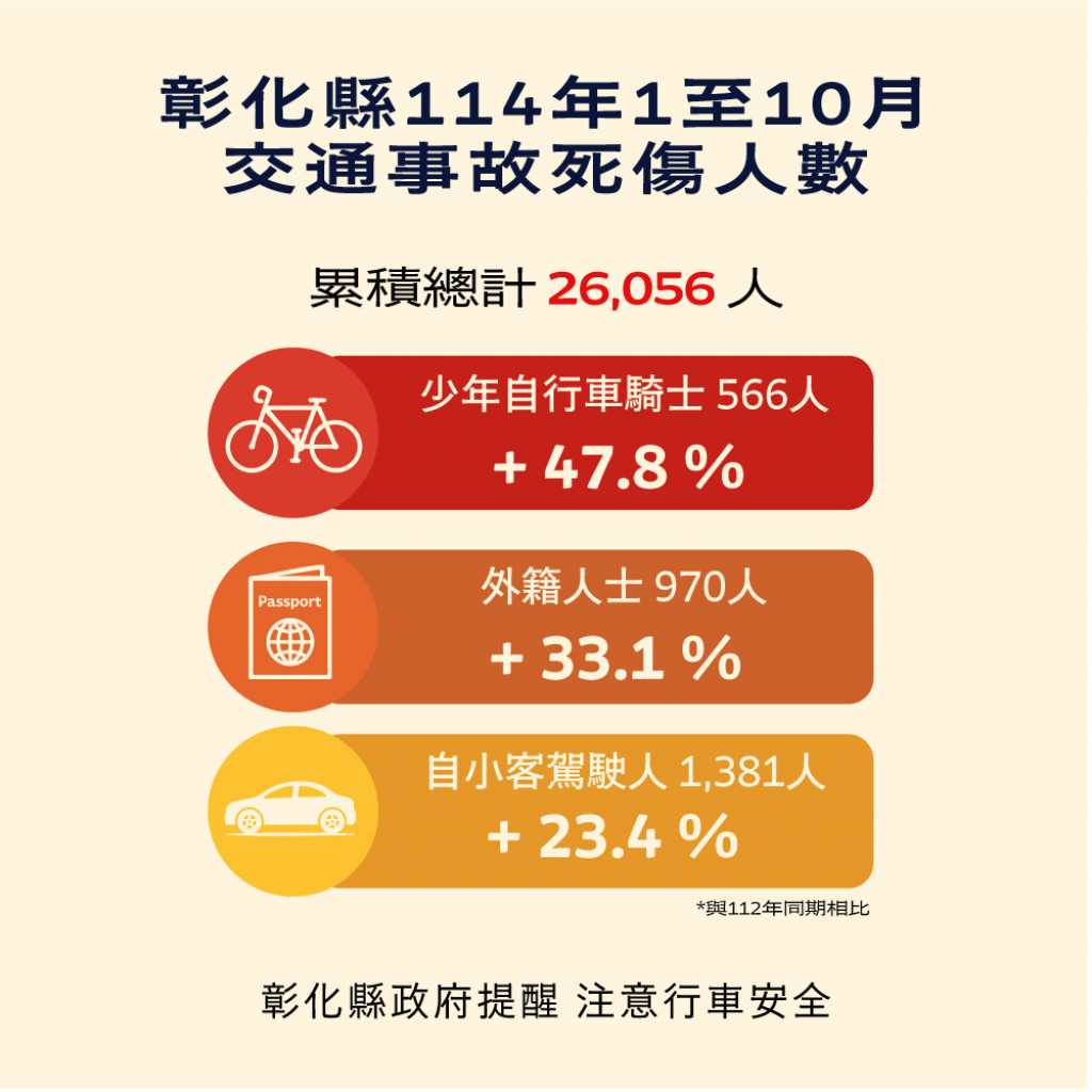 根據交通部道安資訊查詢網,本縣114年1-10月道路交通事故與112年同期比較分析,以少年自行車騎士(含電自、電輔) 事故增加47.8%最高,外籍人士事故增加33.1%次之,自小客車駕駛人增加23.4%再次之。1-10月份鄉鎮市30日死亡人數於「彰化市、員林市、二林鎮、鹿港鎮」為多,肇事熱點以「彰化市」為多。 |