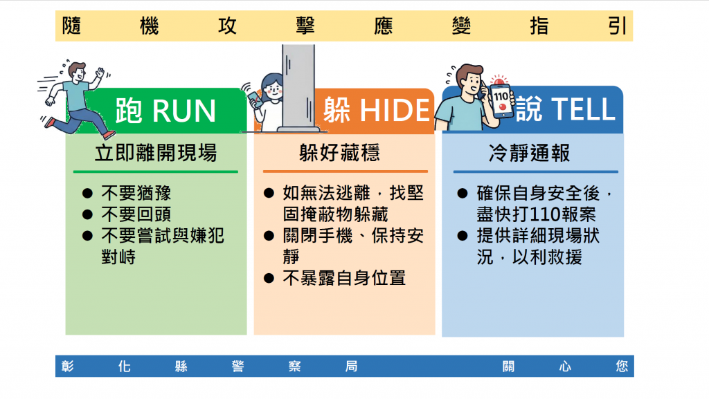一、有鑑於114年12月19日社會發生重大隨機攻擊事件,為預防不當仿效情事以及保護學校教職員工生之安全,本縣警察局研擬公共場所遭遇隨機攻擊之自我保護指引,以利維護校園公共安全之相關工作,以共同提升社會整體安全意識。