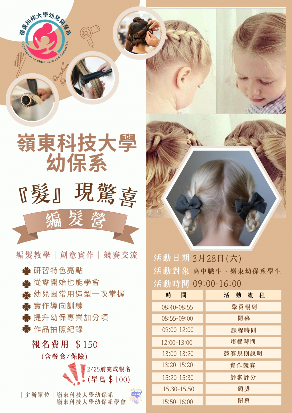 | 二、 | 本活動將於115年03月28日(星期六)上午9時至16時,假本校幼兒保育系仙庭樓1樓HT106教室舉行。 |
