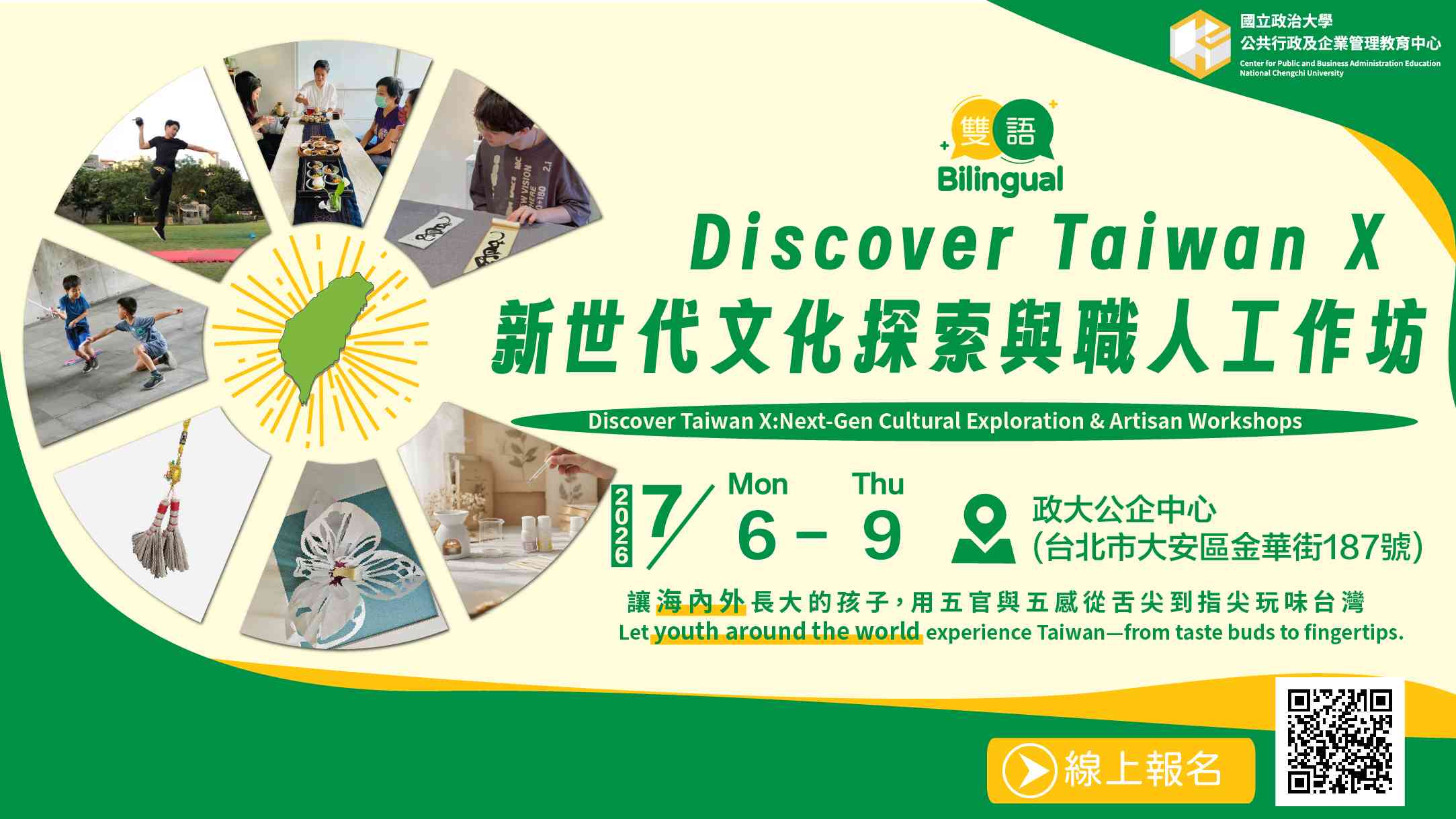 營隊資訊:「Discover Taiwan X 新世代文化探索與職人工作坊」擬訂於民國115年7月6日至7月9日辦理。網址:https://cpbae.nccu.edu.tw/cpbae/class?id=all&classId=N8D2B5071。 |