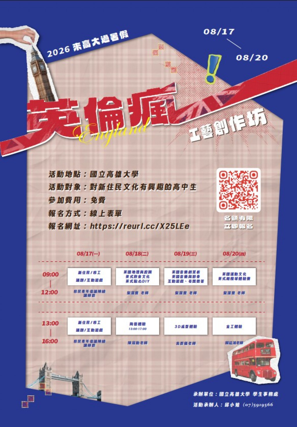 | 二、 | 本活動訂於115年8月17日(星期一)至8月20日(星期四)辦理。報名時間:即日起至額滿截止。 |