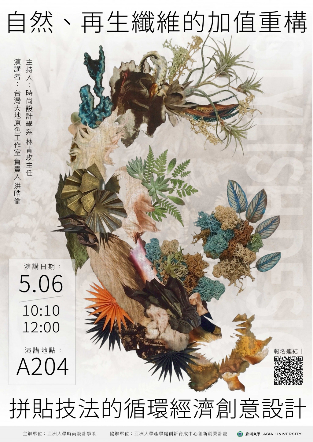 | 三、 | 染色系列講座二:自然、再生纖維的加值重構,拼貼技法的循環經濟創意設計。 |