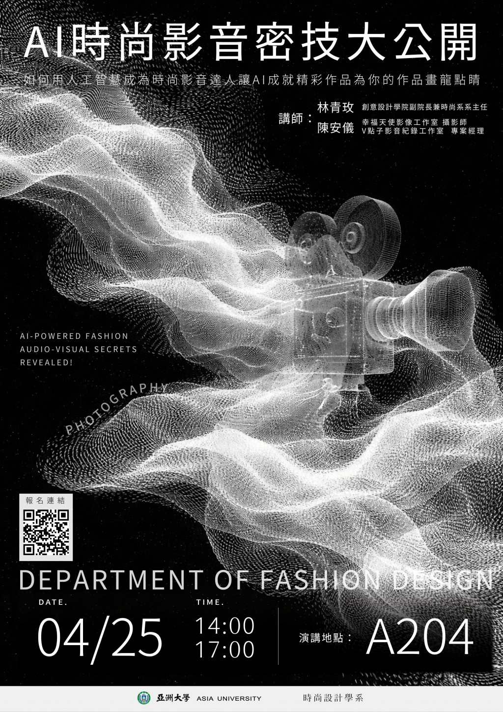 | 一、 | 為協助學生探索時尚設計領域與特色,本校時尚設計學系訂於115年4月25日(星期六)辦理工作營,地點為本校A204教室(亞洲大學A棟創意設計學院大樓2樓)。本次活動共規劃兩場主題工作營,敬請踴躍報名參加。 |